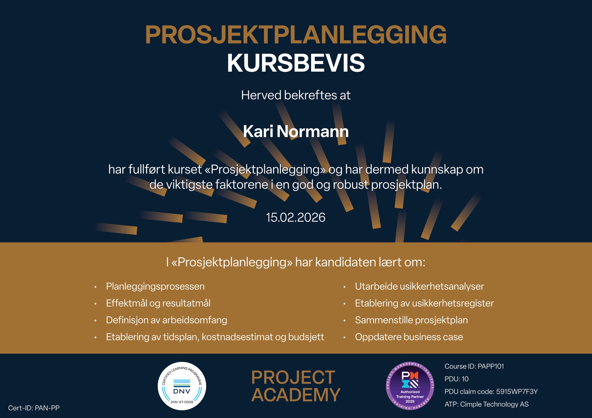 Lær deg å planlegge prosjekter ved å etablere effekt- og resultatmål, definere arbeidsomfang, utvikle tidsplan og budsjett, samt utføre usikkerhetsanalyse med bufferhåndtering. Dette kurset gir deg verktøyene og kunskapen du trenger for å bygge robuste og realistiske planer.